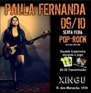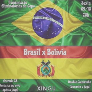 No bar Xingu, hoje transmite a as eliminatórias da Copa com o jogo entre Brasil e Bolívia as 20h e após o jogo tem música ao vivo com Paula Fernanda. O bar abre as 19h e a entrada é 8 reais. E no sábado a banda Biscoito Fino agita o bar com um show elétrico.