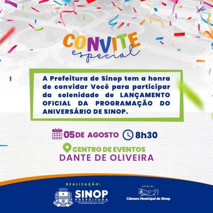 Na solenidade de lançamento do evento, estão confirmadas as presenças, além do prefeito Roberto Dorner, dos secretários municipais, vereadores, representantes de entidades e da comunidade. Sinop comemora 48 anos de história no dia 14 de setembro, no entanto a programação das festividades inicia no dia 02/09 até 14/09.