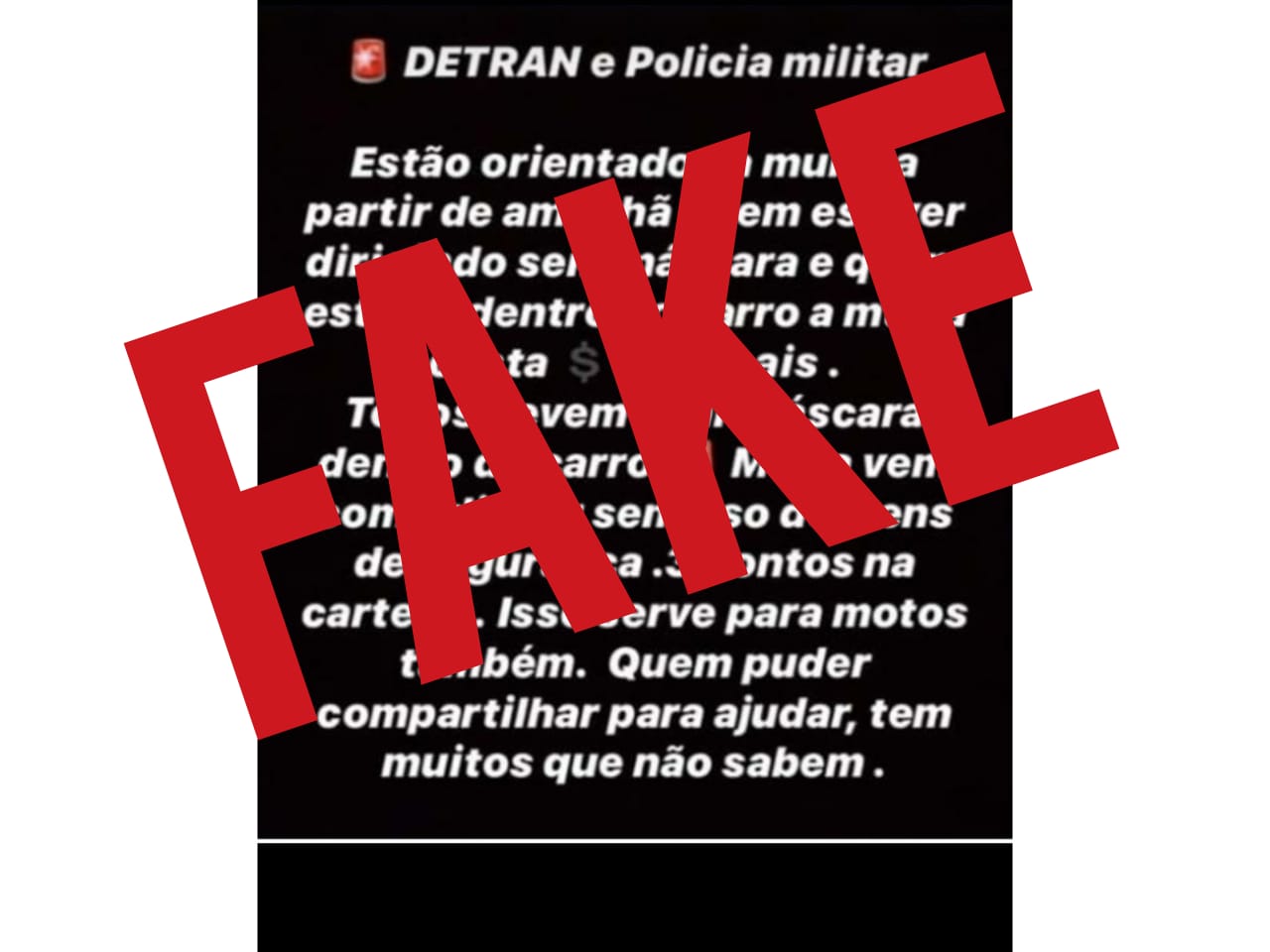 “O detram estará aplicando a partir de amanhã uma multa no valor de R$ 128,00, para motoristas que forem pegos dirigindo sem máscara… 3 pontos na carteira”, a mensagem propagada nas mídias sociais é veiculada como um alerta divulgado pelo Departamento Estadual de Trânsito de Mato Grosso (Detran- MT) e Polícia Militar, no entanto essa notícia é falsa.