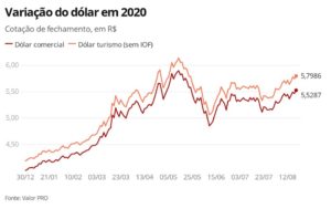 Na véspera, o dólar fechou em alta de 1,14%, a R$ 5,5287 – maior patamar de fechamento desde 22 de maio (R$ 5,5842). Na semana, o dólar passou a acumular alta de 1,83%. No mês, tem alta de 5,97%, e no ano, de 37,88%.