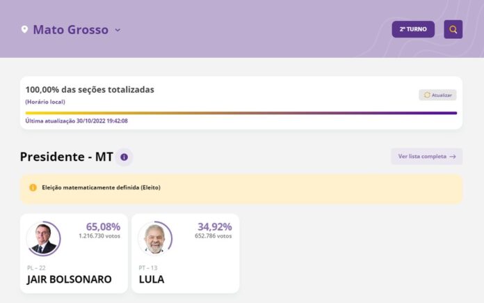 Em Mato Grosso, com 100% das urnas contabilizadas, o atual presidente e candidato à reeleição, Jair Bolsonaro (PL), alcançou 65,08% da preferência dos eleitores, totalizando 1.216.730 de votos. O candidato Luiz Inácio Lula da Silva recebeu 34,92% dos votos – ou seja, 652.786 – no segundo turno das eleições, realizado neste domingo (30).