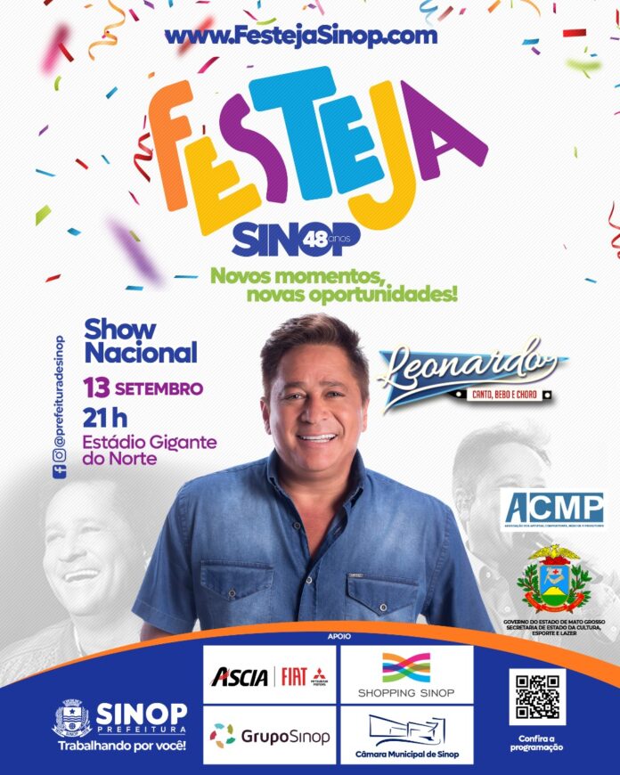 As atividades do Festeja Sinop, em comemoração aos 48 anos do município, continuam nesta terça-feira (13) com show nacional de Leonardo. O evento será no estádio Gigante Norte, com entrada gratuita e abertura dos portões às 20 horas. Também haverá shows regionais do cantor Jhoe Maia e DJ Nay Perin.