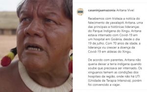 Nas redes sociais, muitos representantes indígenas e instituições falaram da falta que Aritana fará a todos. Nas mensagens, eles exaltam a luta dos povos indígenas e como o cacique sempre fez parte dela.