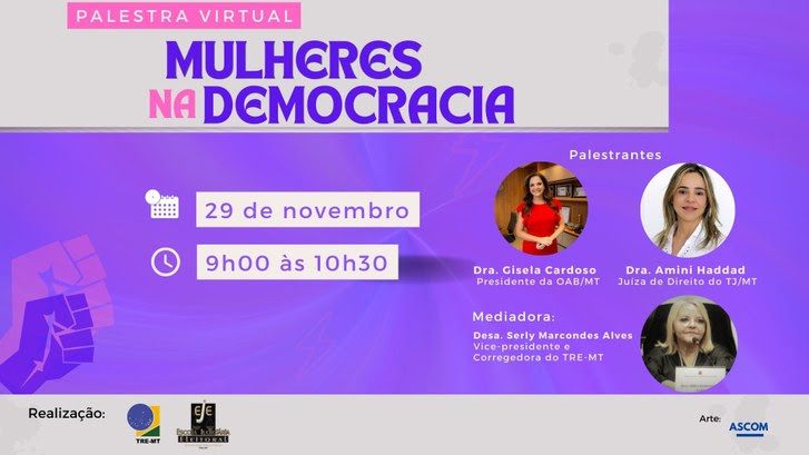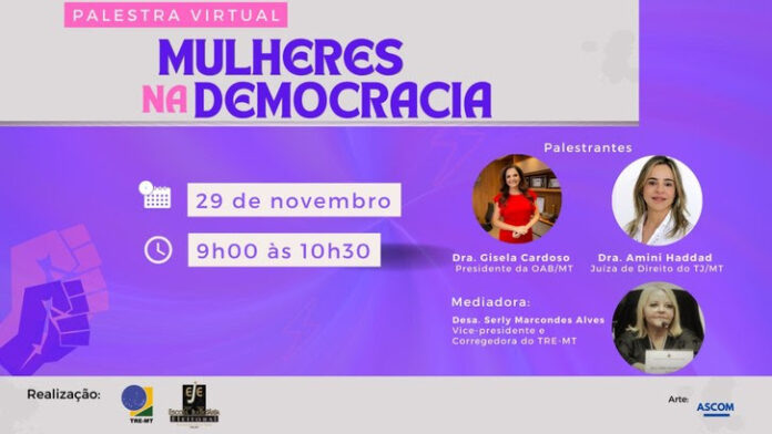 A Justiça Eleitoral de Mato Grosso convida toda a sociedade mato-grossense para assistir a palestra que nesta quarta-feira, dia 29 de novembro, com a temática “Mulheres na democracia”. Para palestrar, foram convidadas a presidente da Ordem dos Advogados do Brasil de Mato Grosso (OAB-MT), Gisela Cardoso, e a juíza do Tribunal de Justiça de Mato Grosso (TJ-MT), Amini Haddad. A palestra está programada para iniciar às 9h com término às 10:30. Em formato virtual, o encontro será no canal do TRE-MT no Youtube. Assista aqui.