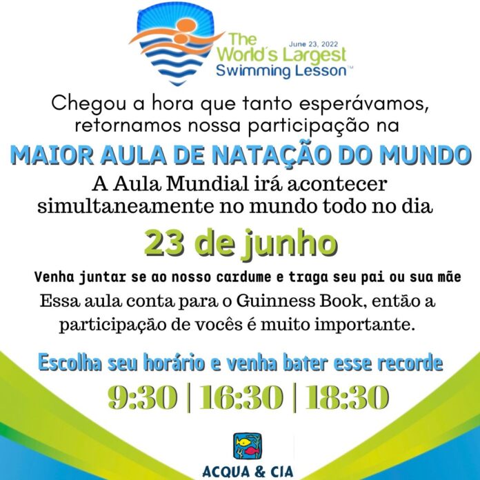 Em 2021 a maior aula de natação do mundo contou com 332.367 participantes cumulativos, este ano este evento mundial de prevenção ao afogamento terá a participação de 12 estados mais o Distrito Federal, em todo o mundo são 5 mil locais anfitriões espalhados em 49 países durante 24 horas de aula e em SINOP está aula acontece na Acqua & Cia.