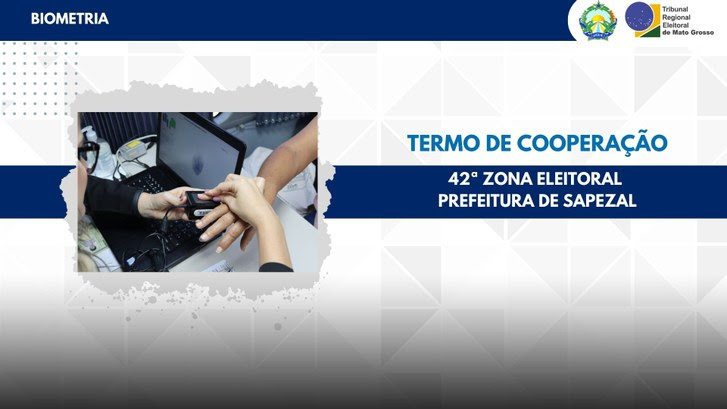 Uma parceria firmada com a Prefeitura do município de Sapezal irá intensificar o cadastramento biométrico de eleitores(as). O órgão cederá servidor(a) para realizar o atendimento na sede do Cartório da 42ª Zona Eleitoral, localizado na Av. Jaime Schecheli, n° 939, bairro Cidezal IV.
