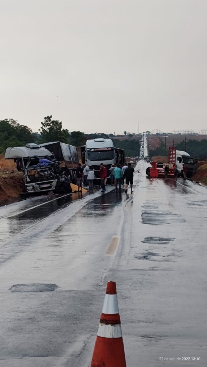 Quatro carretas e um carro se envolveram em um acidente grave, na tarde desta quinta-feira (22), no km 771 da BR-163, em Sorriso, no médio-norte do estado. Chovia na região durante o acidente. As causas da colisão ainda são investigadas pela Polícia Rodoviária Federal (PRF).