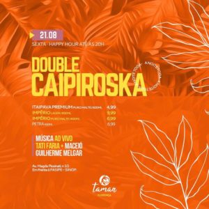 O Taman bar do Florença abre a sexta com som ao vivo de Tati Faria e Guilherme Melgar, o happy hour vai até ás 20h e o bar terá double caipiroska a noite toda