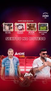O Boteco Zero66 abre o sextou com promoção de triplo chopp a R$ 11,99 e double caipirinha. O som é com André Luís e Marco Aurélio