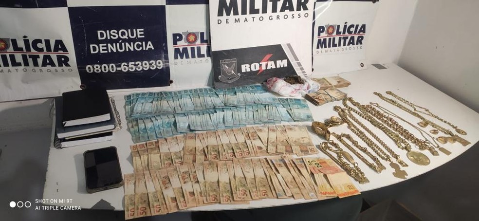 inheiro e itens em ouro foram apreendidos pela Rotam. — Foto: Polícia Militar/Cedida